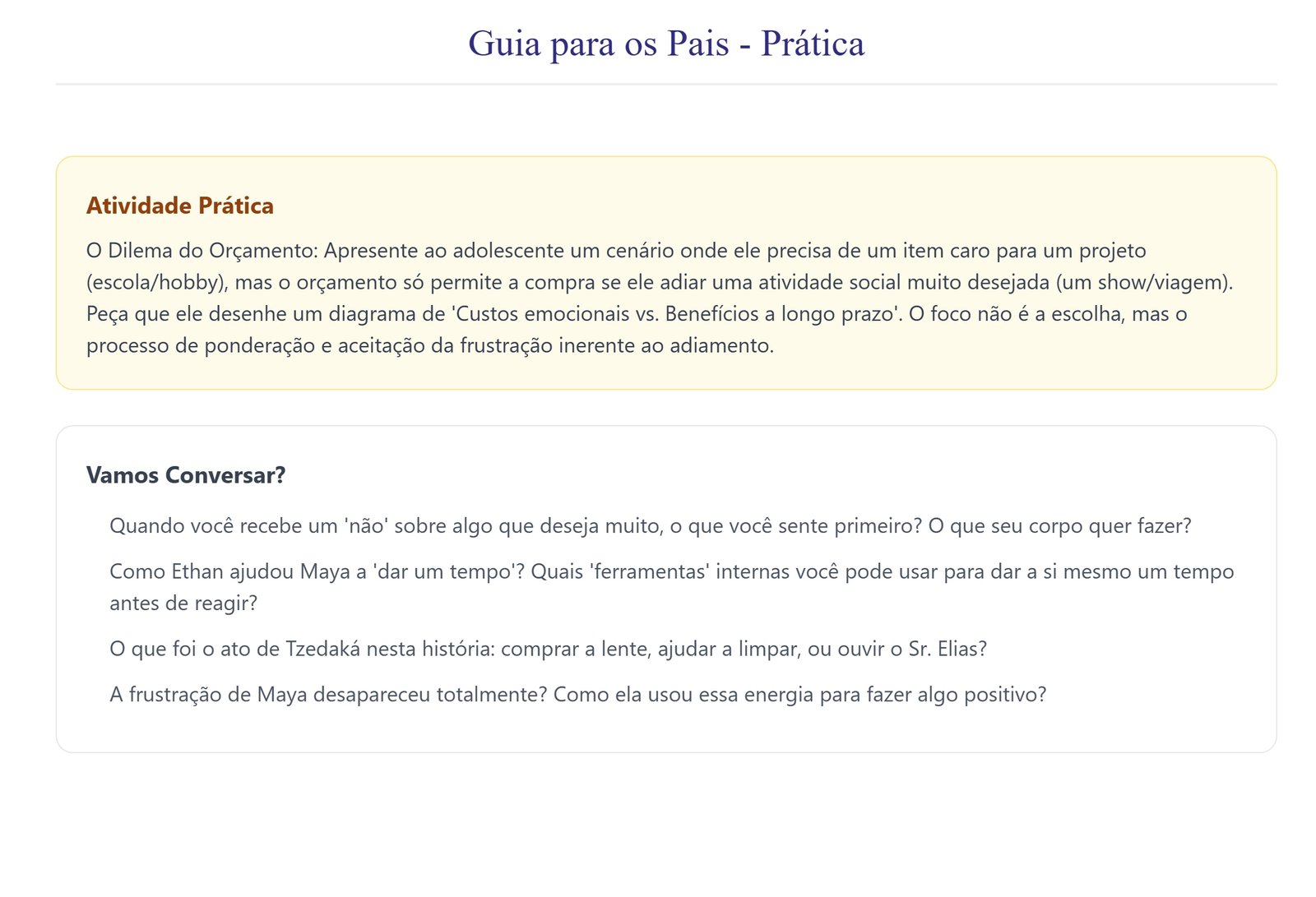 Aplica valores judaicos à vida real: Traduz conceitos abstratos como Savlanut (paciência) e Tzedaká (justiça social/caridade) em ações práticas, mostrando que Tzedaká inclui doar tempo e esforço, não apenas dinheiro.Fornece ferramentas de diálogo: Inclui perguntas para discussão e atividades práticas, como “O Dilema do Orçamento”, para treinar a ponderação entre custos emocionais e benefícios a longo prazo.